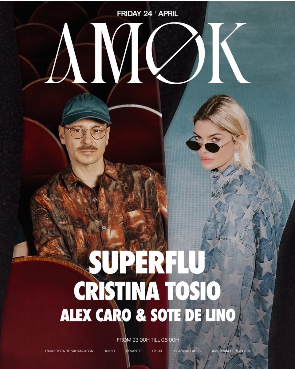 A late-night club session at Amok Mallorca brings together Superflu and Cristina Tosio, joined by Alex Caro and Sote de Lino, for an extended night of electronic music from Friday into Saturday.
