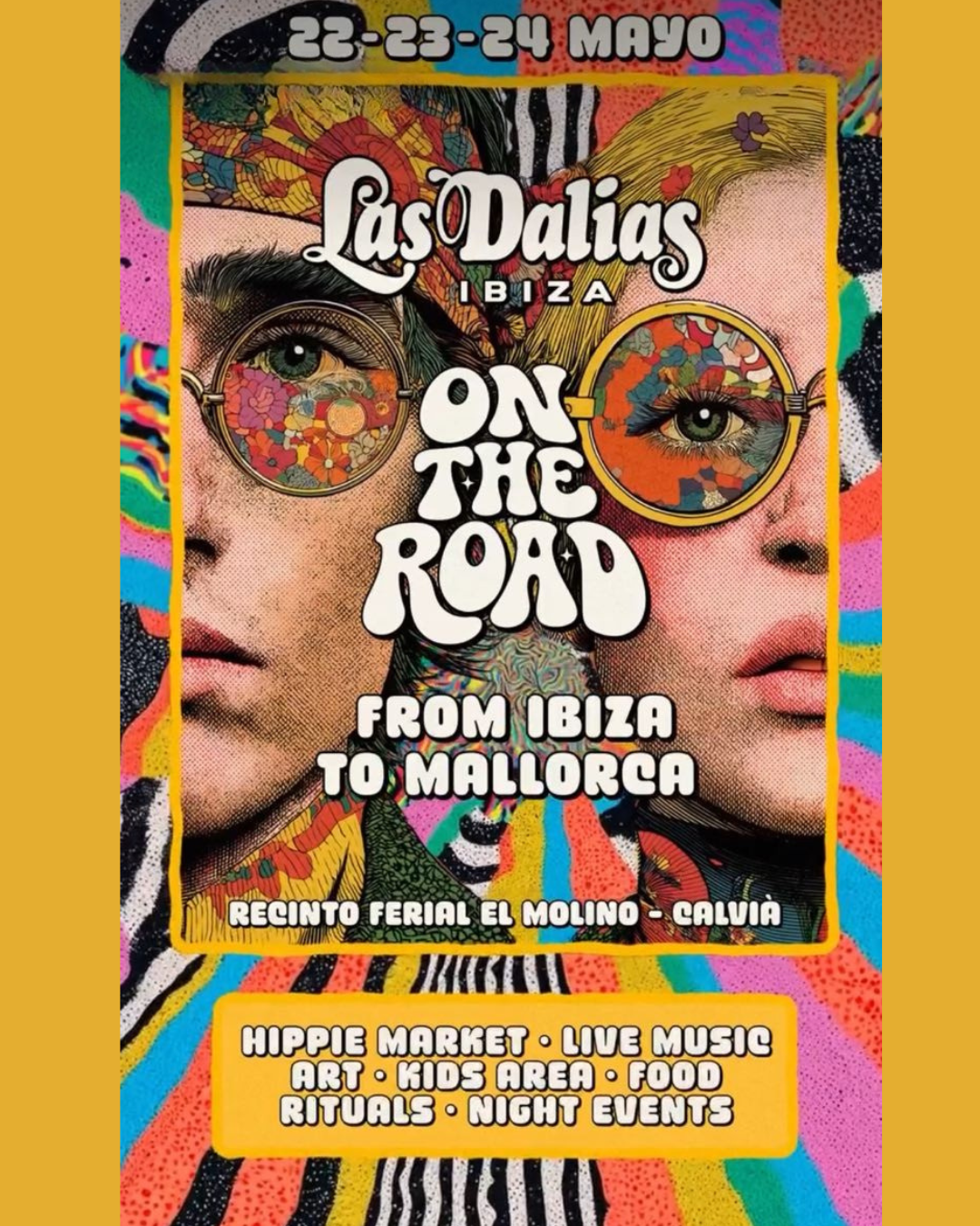 The event combines a hippie market with handcrafted products, live music performances, art installations and a diverse food offering. The program also includes a kids area, rituals and night-time events, creating a multi-day experience inspired by the free-spirited culture associated with the original Las Dalias market in Ibiza.
