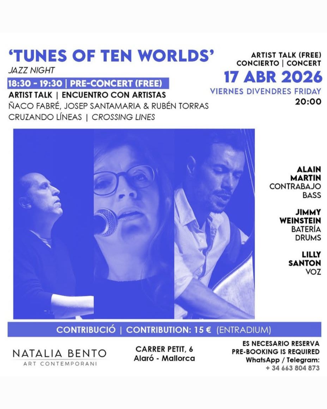 A jazz evening at Natalia Bento Art Contemporani in Alaró brings together vocalist Lilly Santon, bassist Alain Martin and drummer Jimmy Weinstein for Tunes of Ten Worlds. Before the concert, the venue hosts a free artist talk from 18:30 to 19:30 with Ñaco Fabré, Josep Santamaria and Rubén Torras under the theme Crossing Lines, followed by the concert at 20:00.